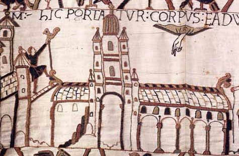 The Romanesque Westminster Abbey, begun 1040s,  from the scene of the burial of King Edward, The Bayeaux Tapestry, 1070s.