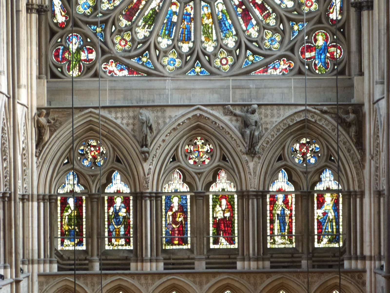 Westminster Abbey, south transept counter-facade. Detail of glazed triforium of gallery zone and base of rose window.