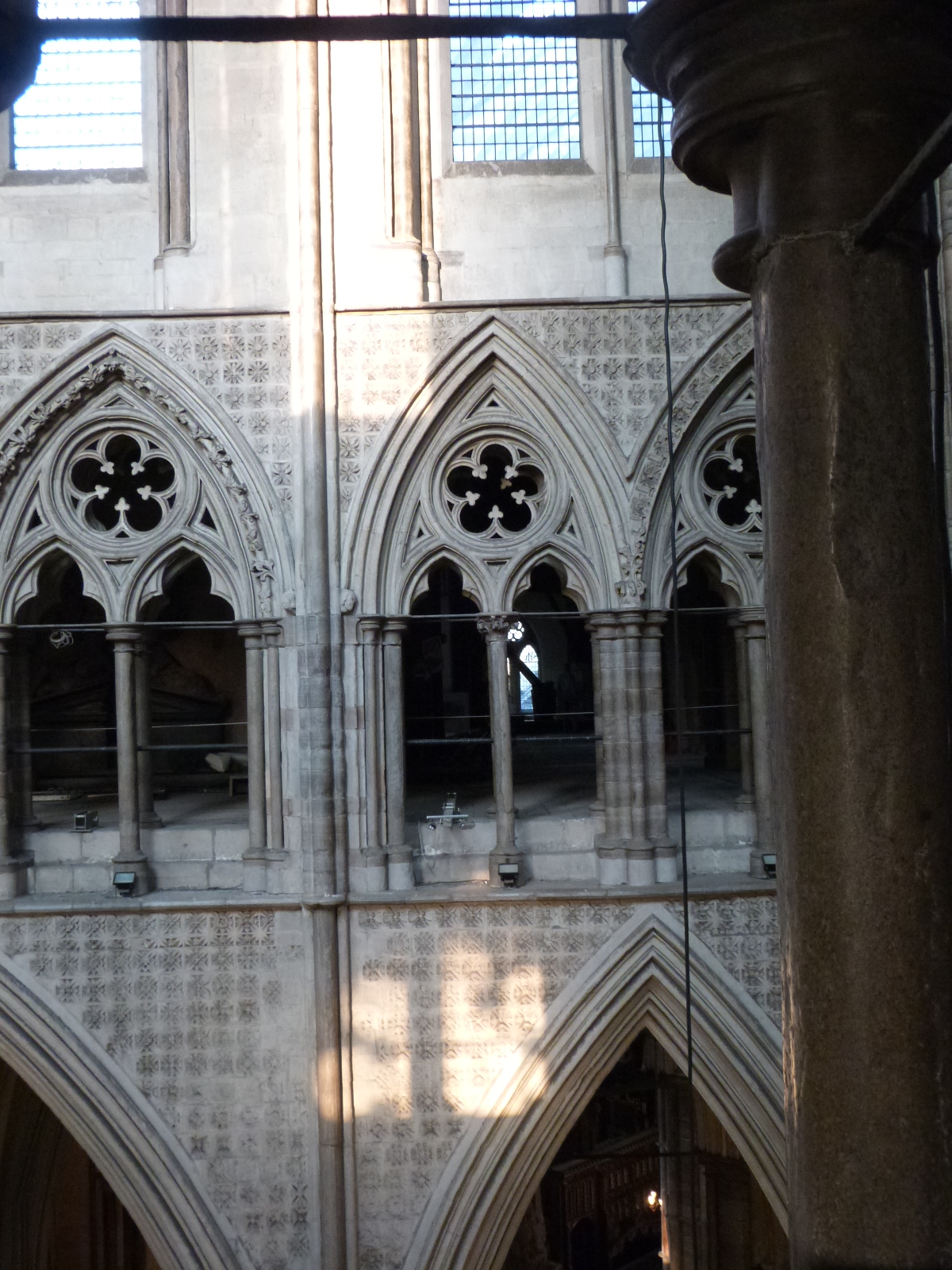 Westminster Abbey, detail of the arcade and gallery, showing diaper ornament. Notice that there’s no real system on whether they should go right up to both the shafts and the arcade arches or not.