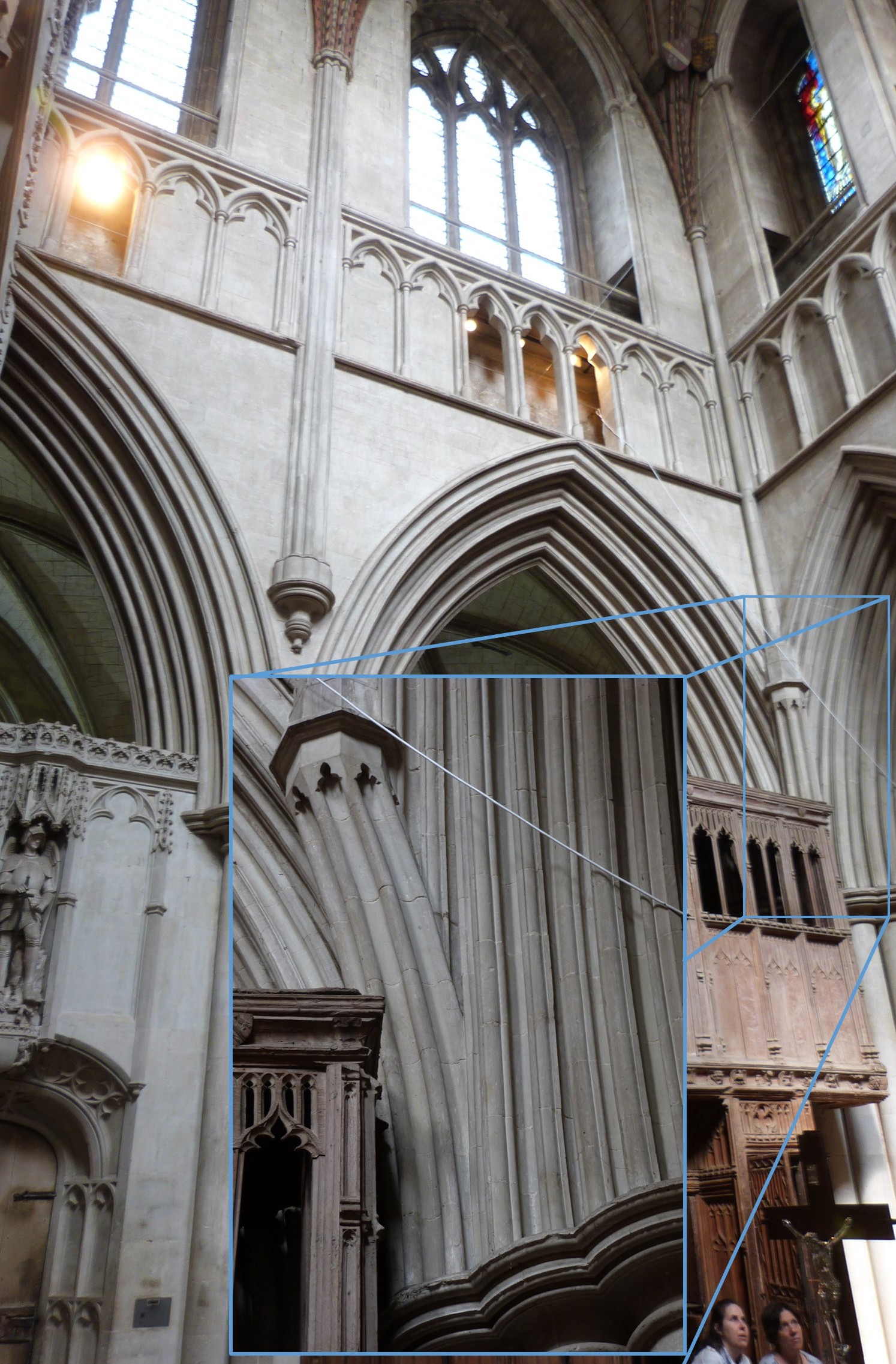 About the only solecism that the decidedly Ready-Salted architecture of the presbytery allows is when they get to the corners and there’s no plain spandrel space for the vault corbel to go in, so they decide to bend out the arch mouldings to catch it. It looks kinda gross.