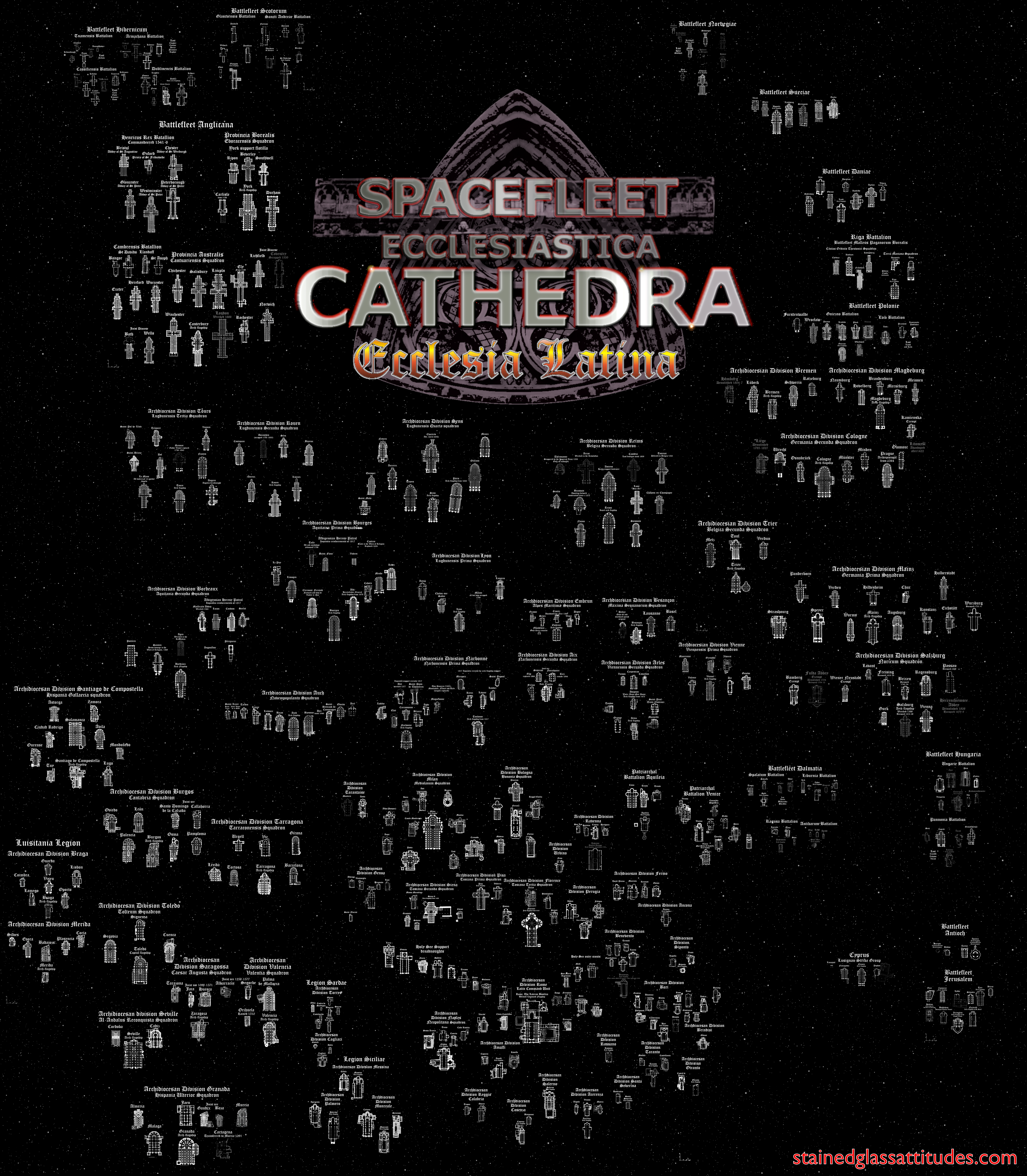 So here is the ultimate outcome of the Spacefleet Ecclesiastica project as begun just over two years ago in September 2020: a map of every cathedral in the medieval Latin Church. Of course there’s a certain elasticity to the definition of “medieval” here: the Latin bishops’ seats in the Crusader States and Greenland were long vacant by the time the great Renaissance cathedrals of Andalusia were built. But at least it’s before swathes of northern European states seceded from the papacy, and the Catholic Church began to expand across the Atlantic Ocean into the Americas. The map is based on the categories I’ve approached the project from (England, France, Holy Roman Empire, Iberia, Frontiers and the Crusader States) as an overall map of the diocesan structure of the Latin Church.